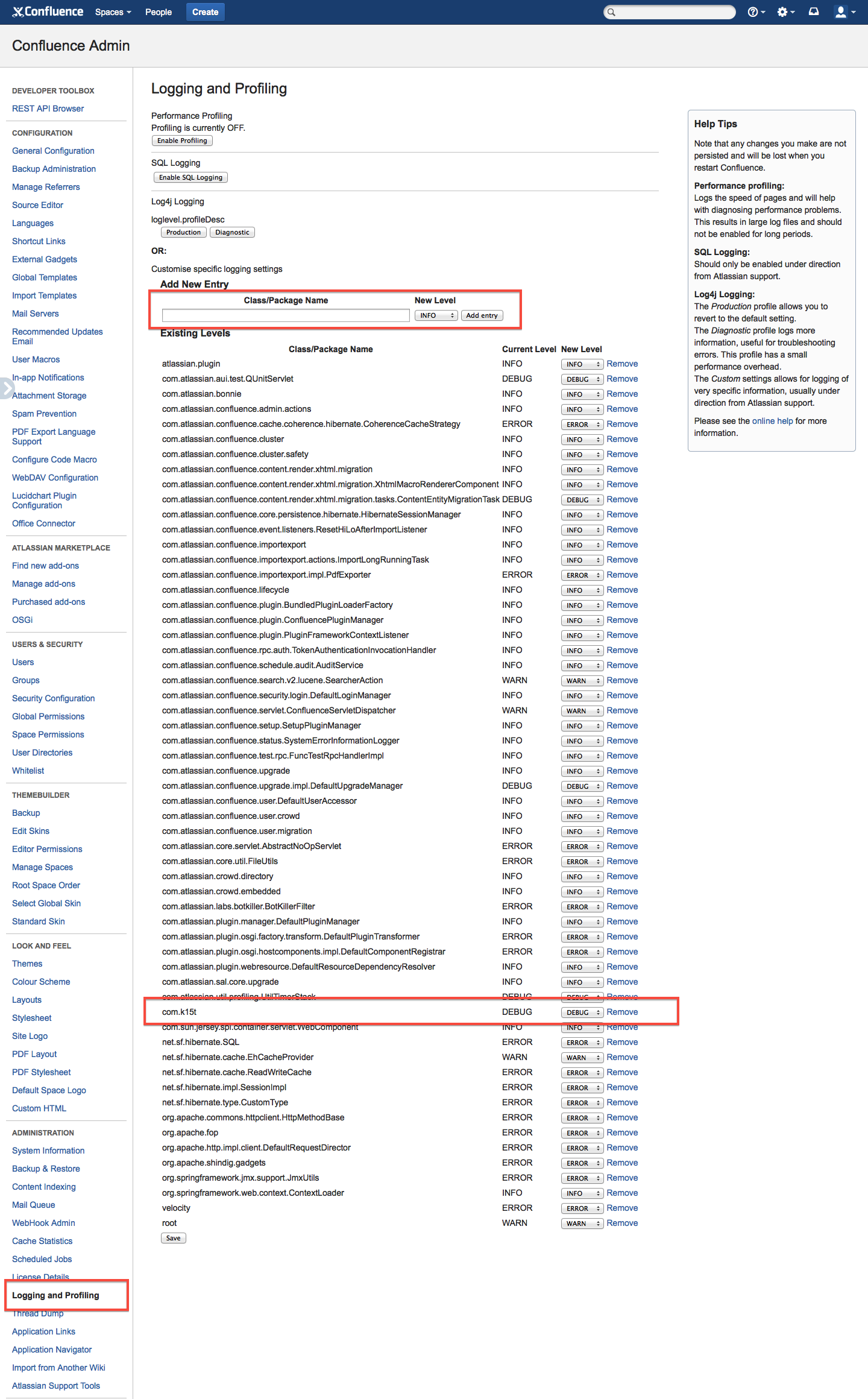 The screen Logging and Profiling is displayed. For more information about the screen, see Configuring Logging in the Atlassian Confluence documentation.Enter