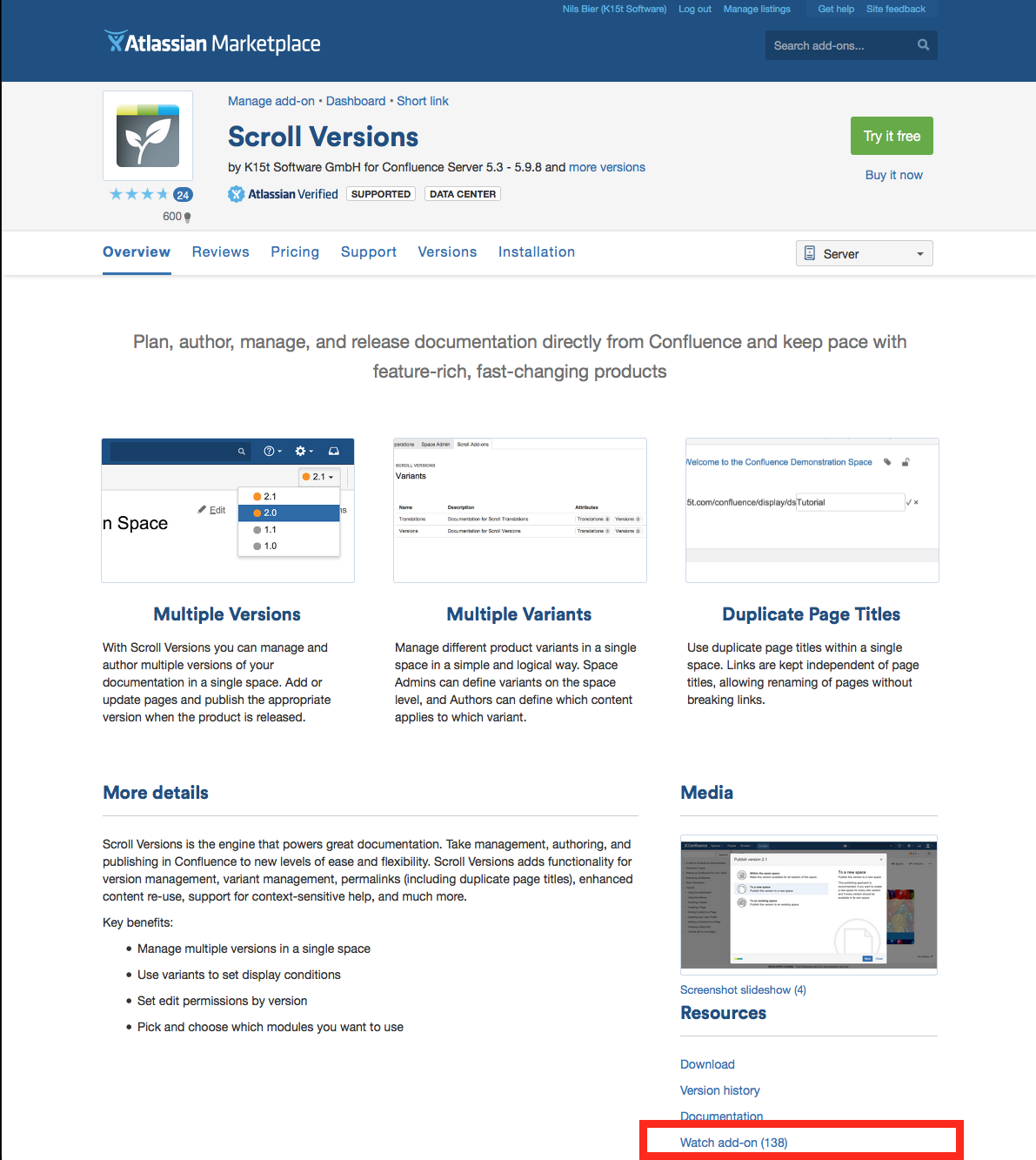 Before you begin: To watch an add-on you have to log in to the Atlassian Marketplace using your My Atlassian account.